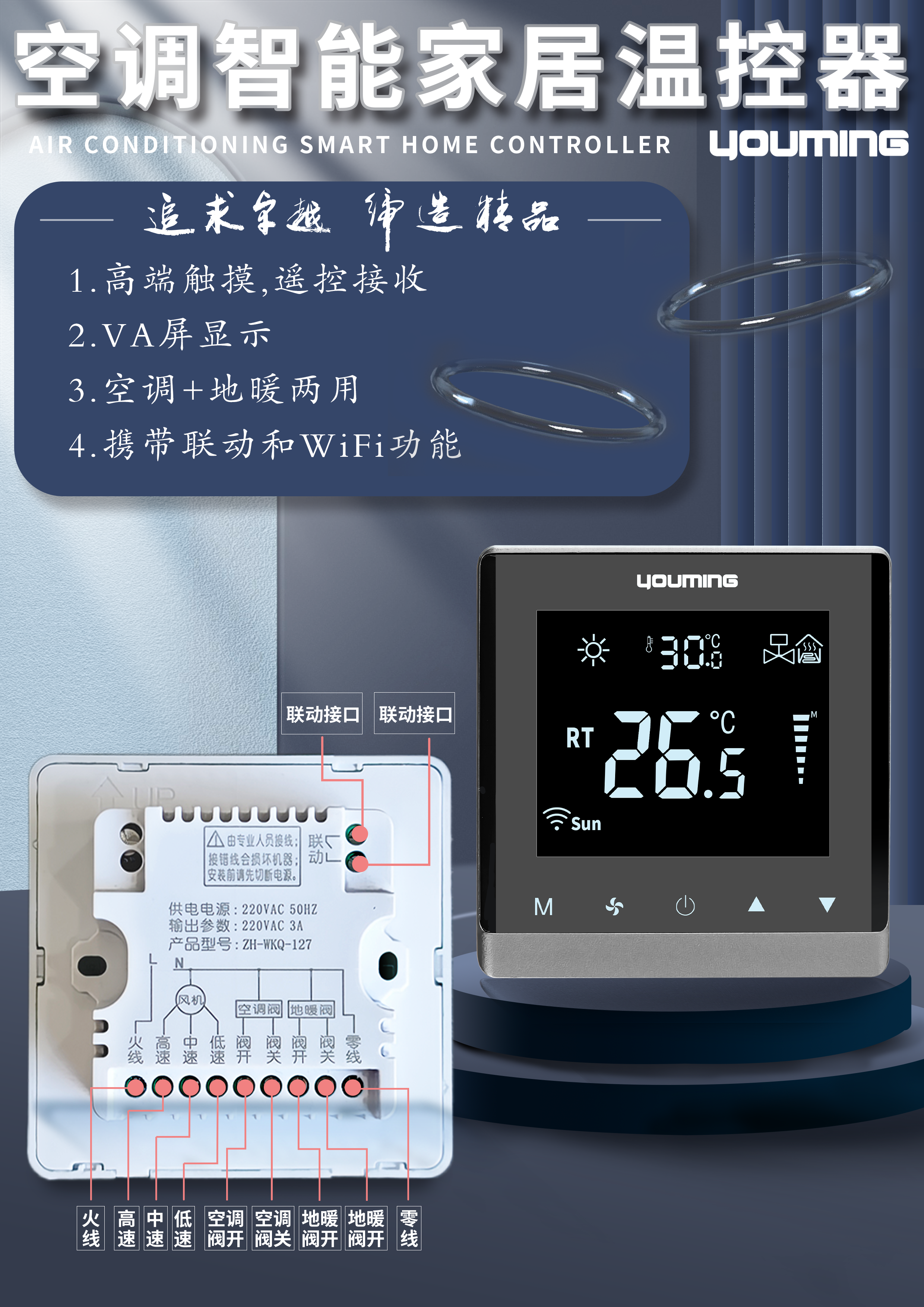 **解决方案**:联创云辰提供新风款ZH-XF-001温控器,支持LoRa无线协议(无遮挡通信距离达500米),与楼宇自控系统通过Modbus协议无缝对接,实现分区精准控温与新风联动。